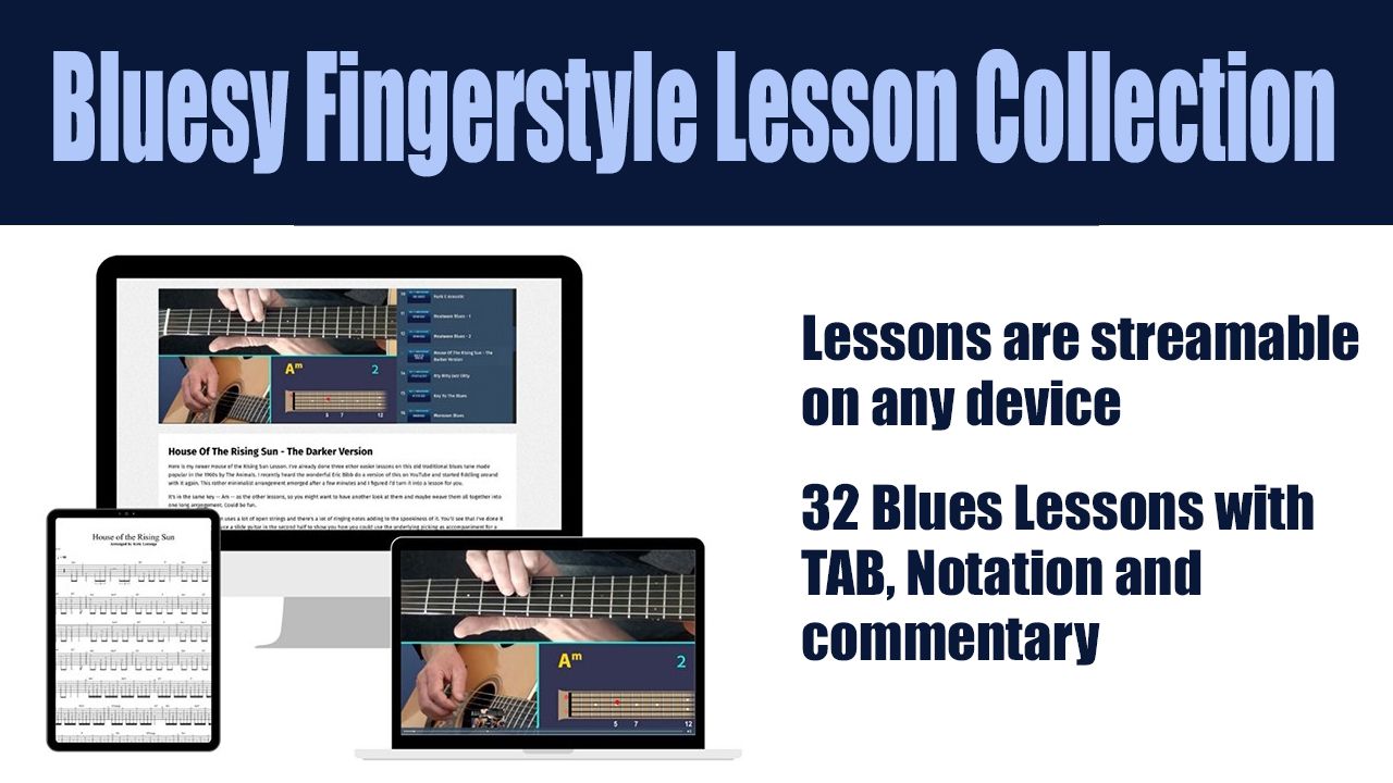 * Lifetime access to 32 Blues Fingerstyle Lessons (titles listed below) arranged specifically for guitar.